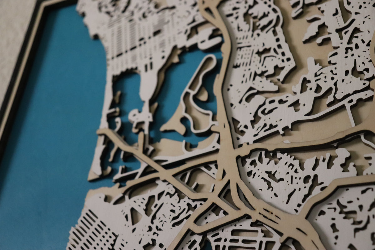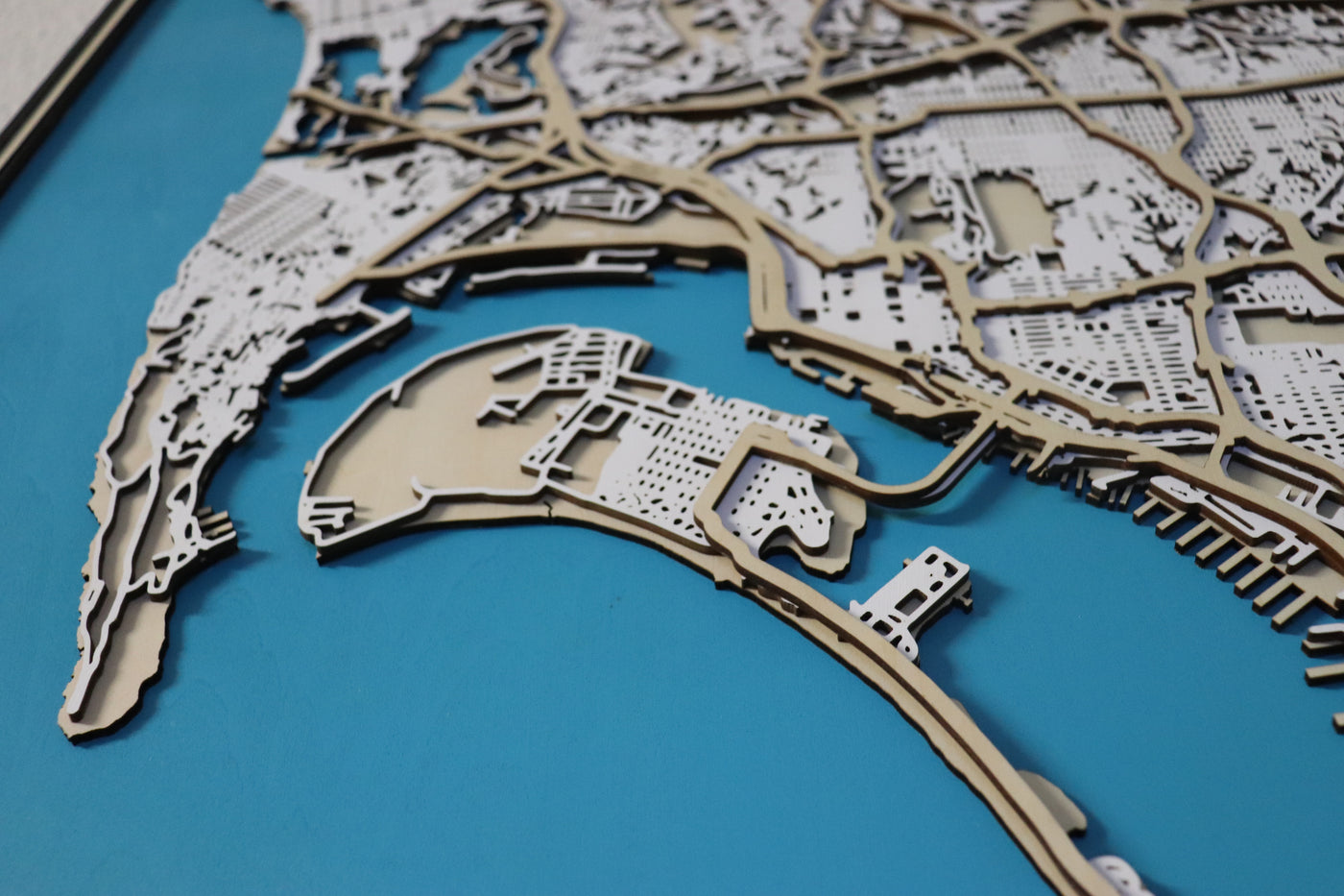 Layered Design: Each layer of land, water, blocks, and streets is individually highlighted, with water areas standing out in a rich blue, adding a striking contrast to the wooden design.